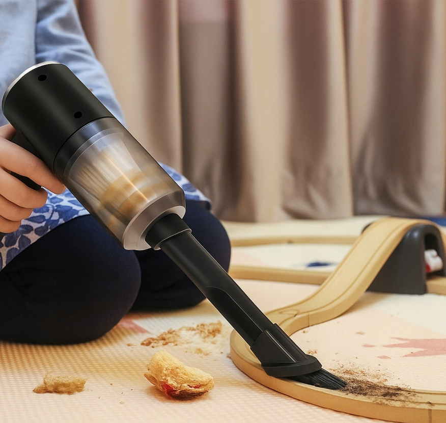 Ładowanie przez USB umożliwia korzystanie z ładowarki samochodowej, powerbanka lub portu USB. Trzy wymienne końcówki pozwalają dopasować sposób sprzątania do różnych zabrudzeń. Urządzenie nadaje się do odkurzania na sucho i mokro, skutecznie usuwając piasek, okruszki, sierść oraz niewielkie ilości płynów.