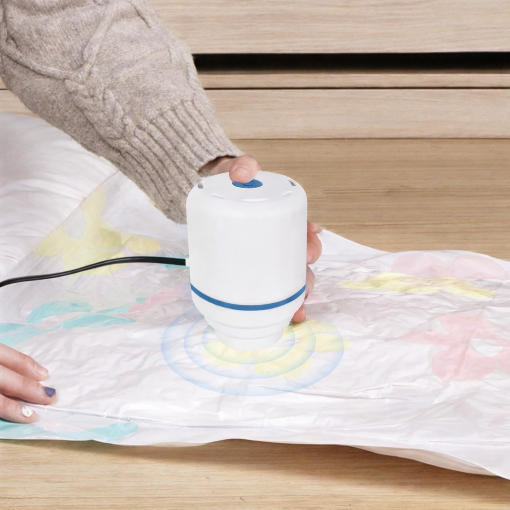 ✅ Elektryczna pompka próżniowa umożliwia szybkie i wygodne usuwanie powietrza z worków przeznaczonych do przechowywania ubrań, pościeli oraz innych tekstyliów.