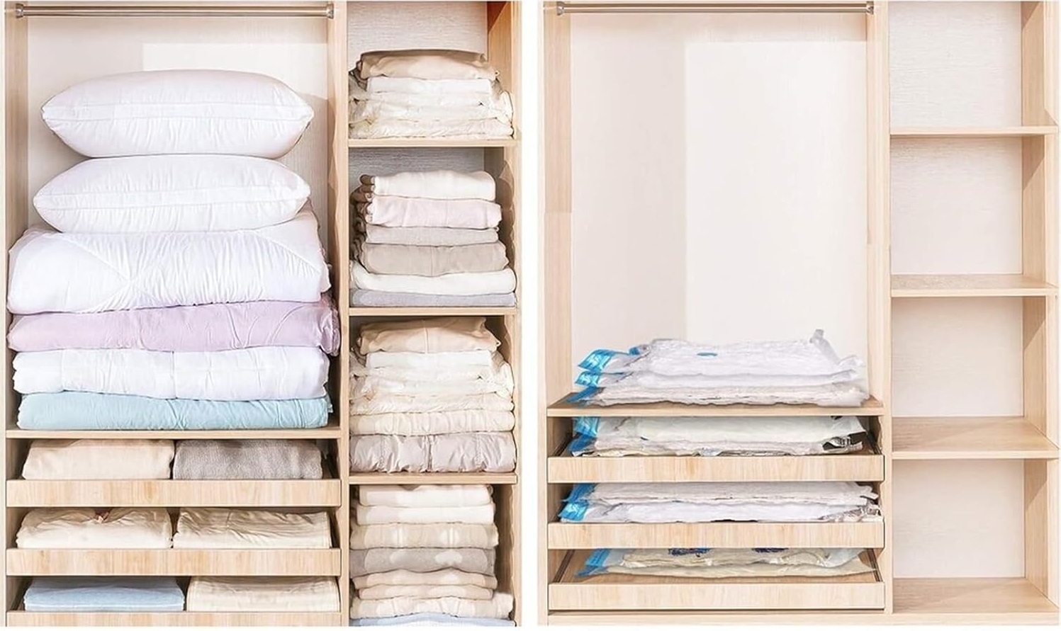 Dzięki wykorzystaniu worków próżniowych możliwe jest znaczne zmniejszenie objętości przechowywanych rzeczy.