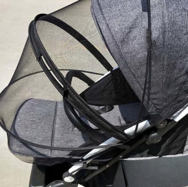 Moskitiera jest obszerna, dlatego po jej zamontowaniu wewnątrz znajdzie się dużo miejsca dla dziecka. Wyposażona jest w specjalne usztywniające pałąki, dzięki którym zachowuje kształt – w odróżnieniu od większości tradycyjnych moskitier do wózków czy łóżeczek.