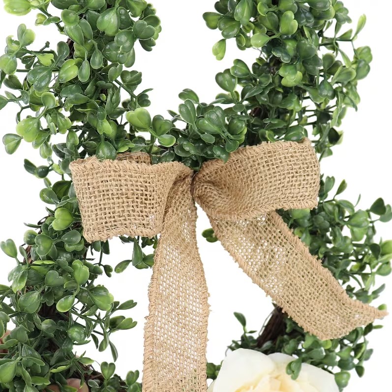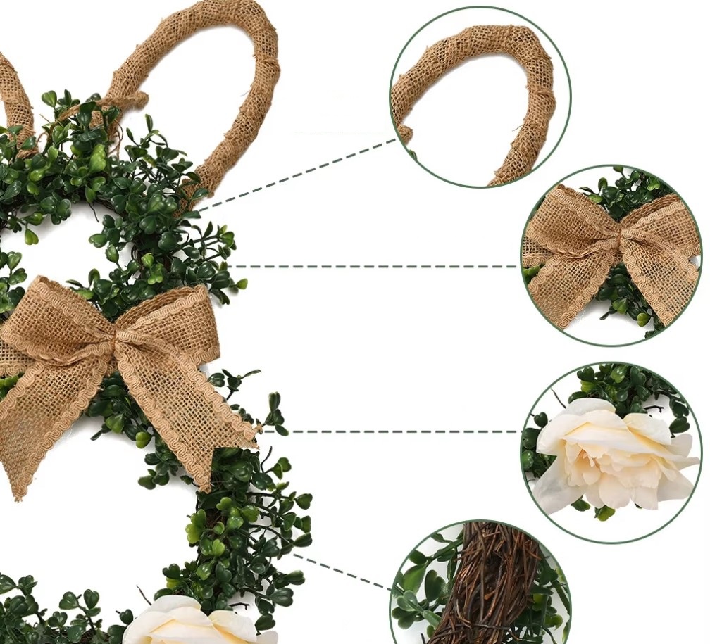 Wianek wykonany jest z gęsto ułożonych, drobnych listków w różnych odcieniach zieleni, co nadaje mu naturalny wygląd. Stabilna podstawa z przeplatanych gałązek utrzymuje formę i zapewnia trwałość.